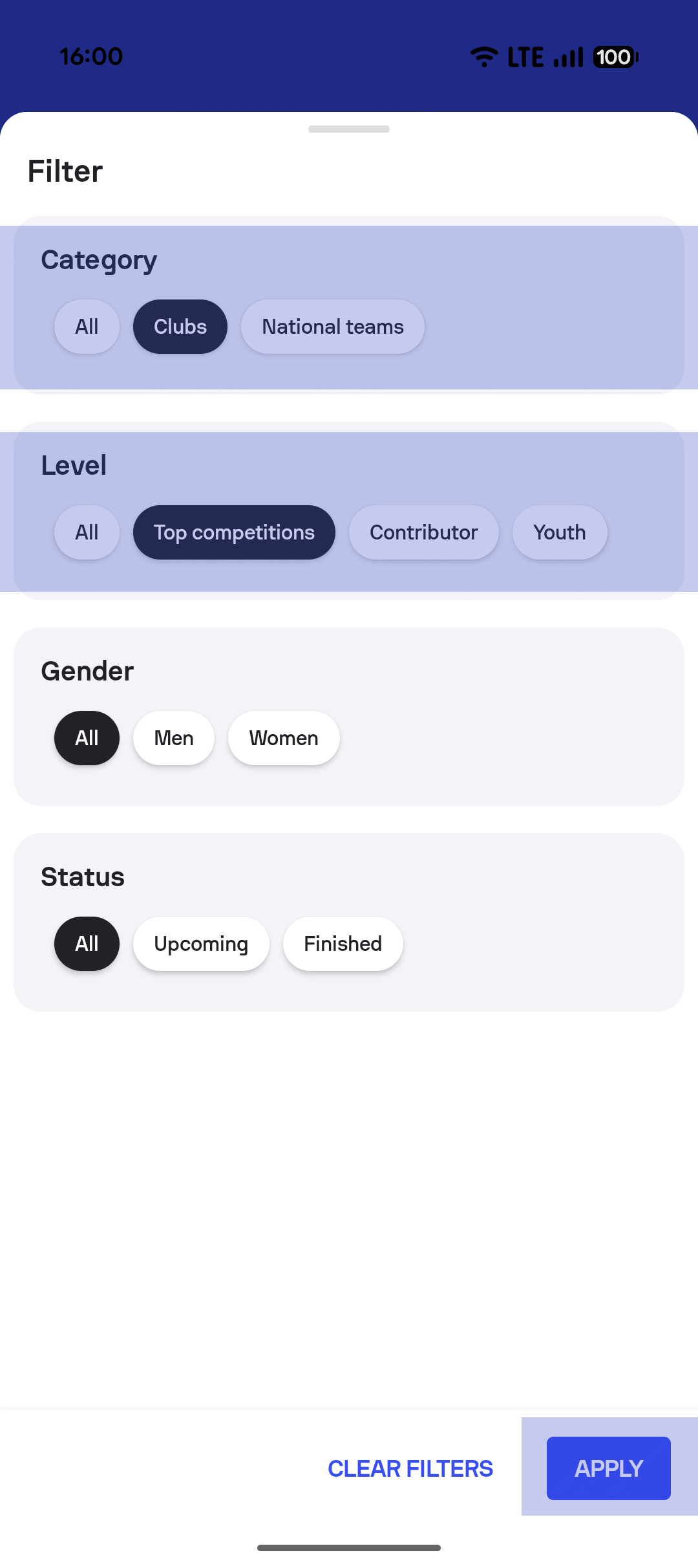 - Under Level, select Top competitions