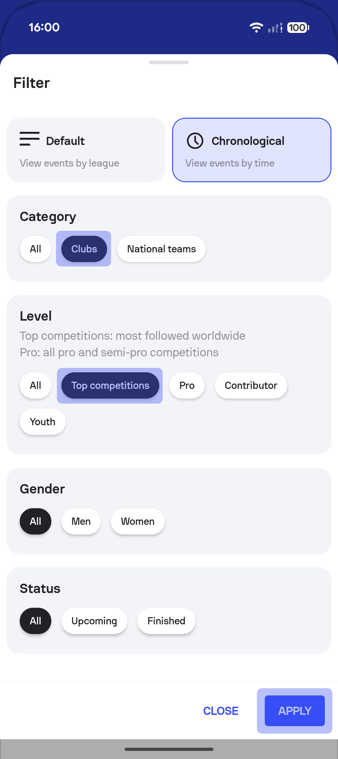 - Level: All, Top competitions (more than 25k follower), Pro (all matches except amateur), Contributor, Youth