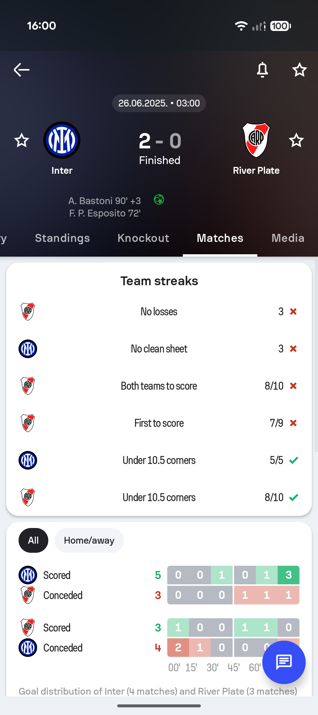 - The same for the following streak, River Plate was first to score in past 7/9 matches, here Inter scored first, so that's one more x.