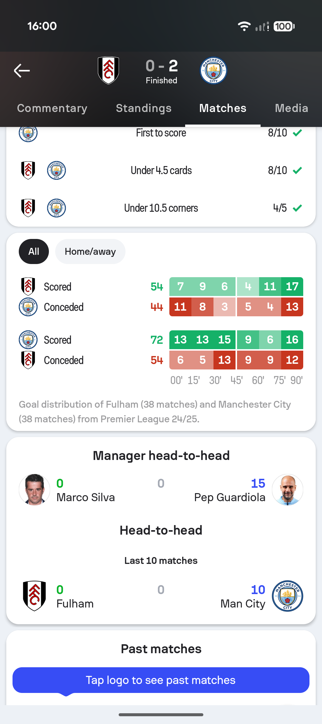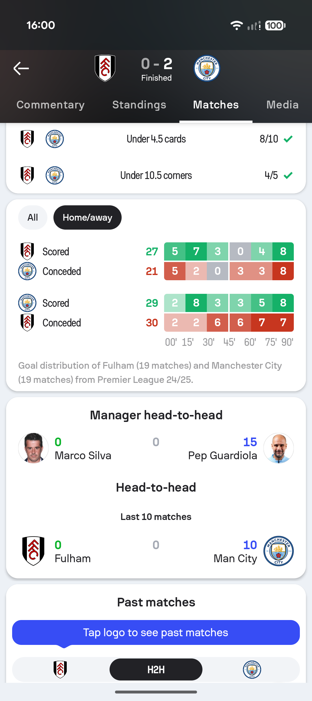 Here we show goal distribution for Fulham home matches, and Man City away matches (because Fulham plays at home in this match, and Man City is away). This is the same data you can see in the league’s home/away standings.