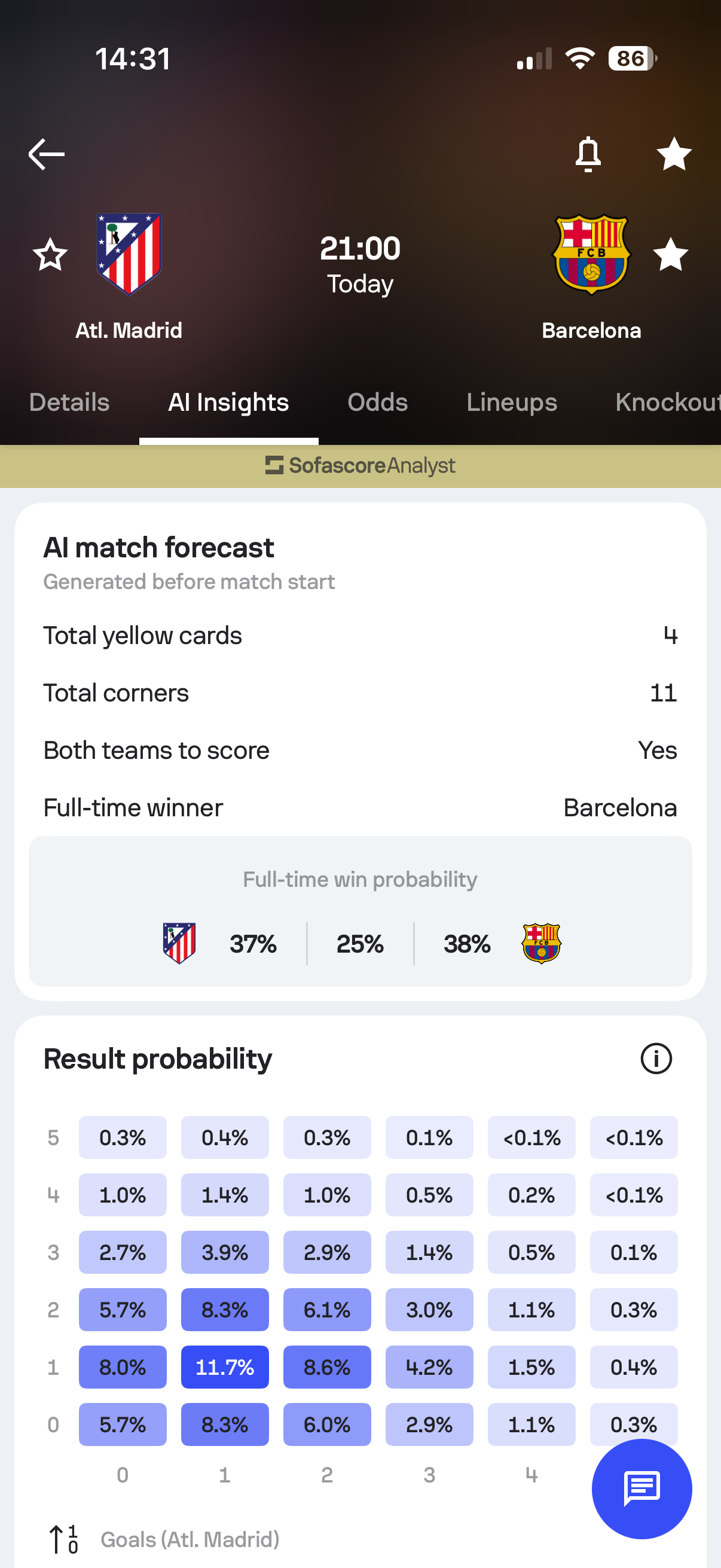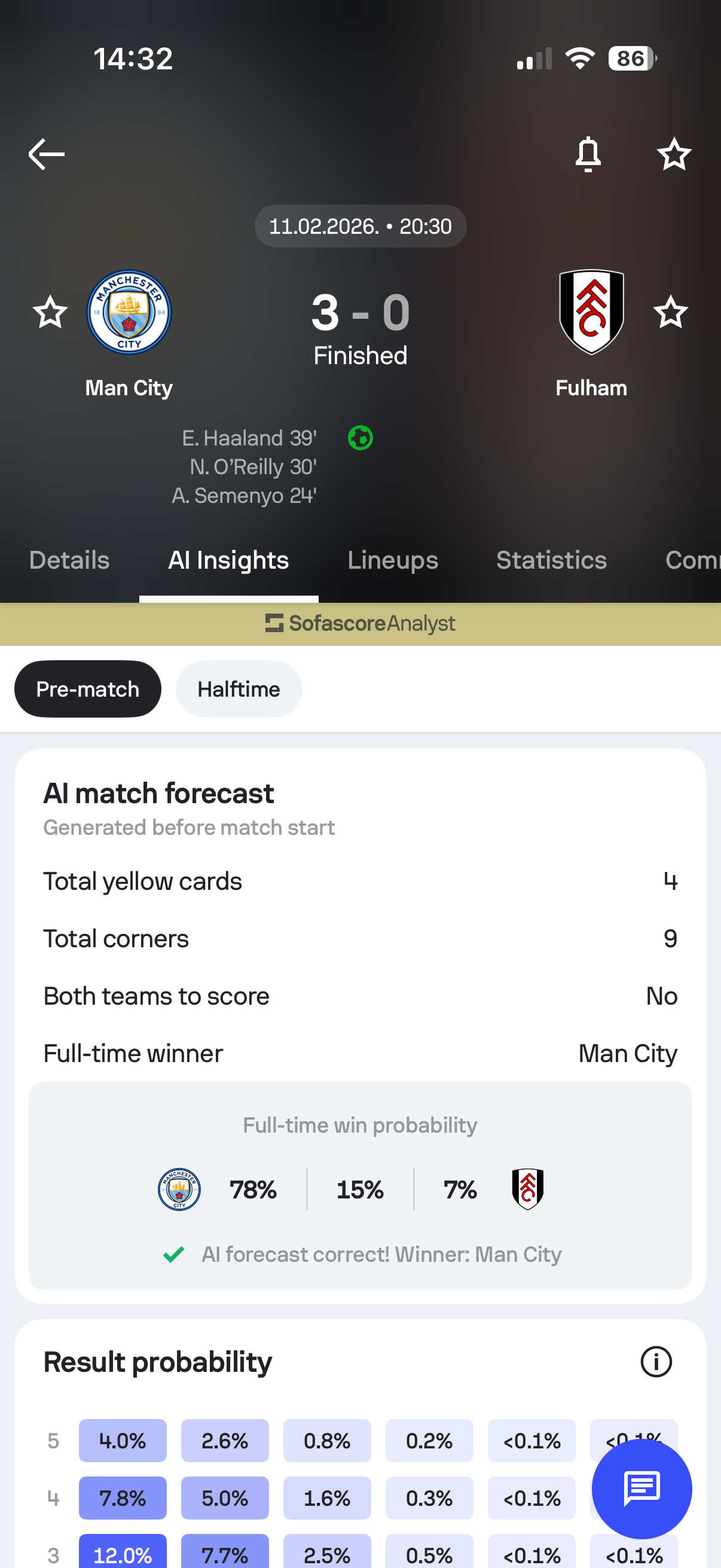 After the match ends, the AI Insights section updates so you can compare the predictions with the final result.