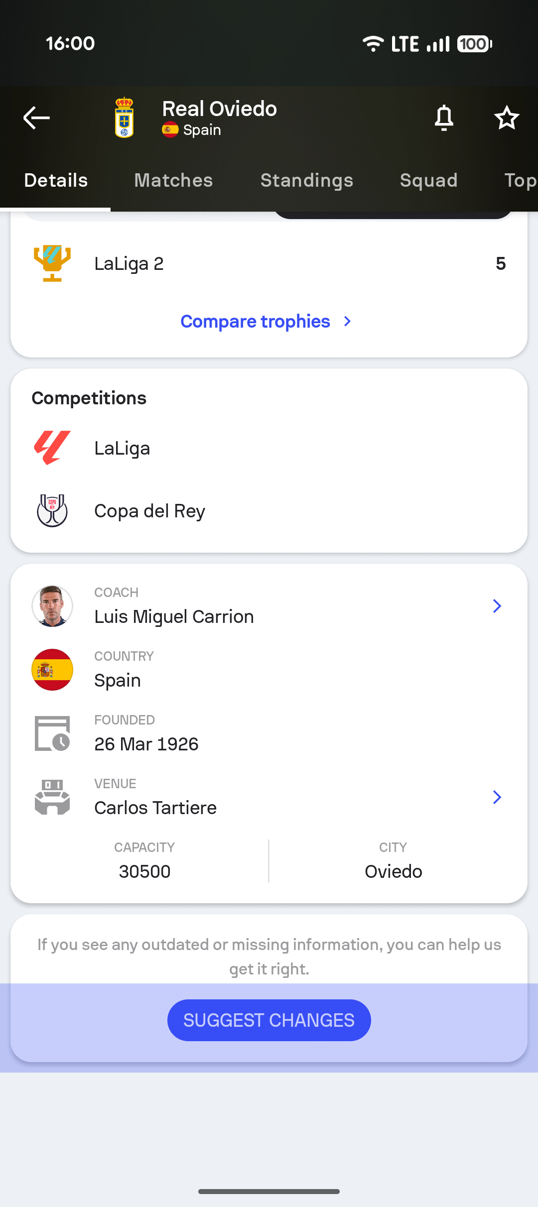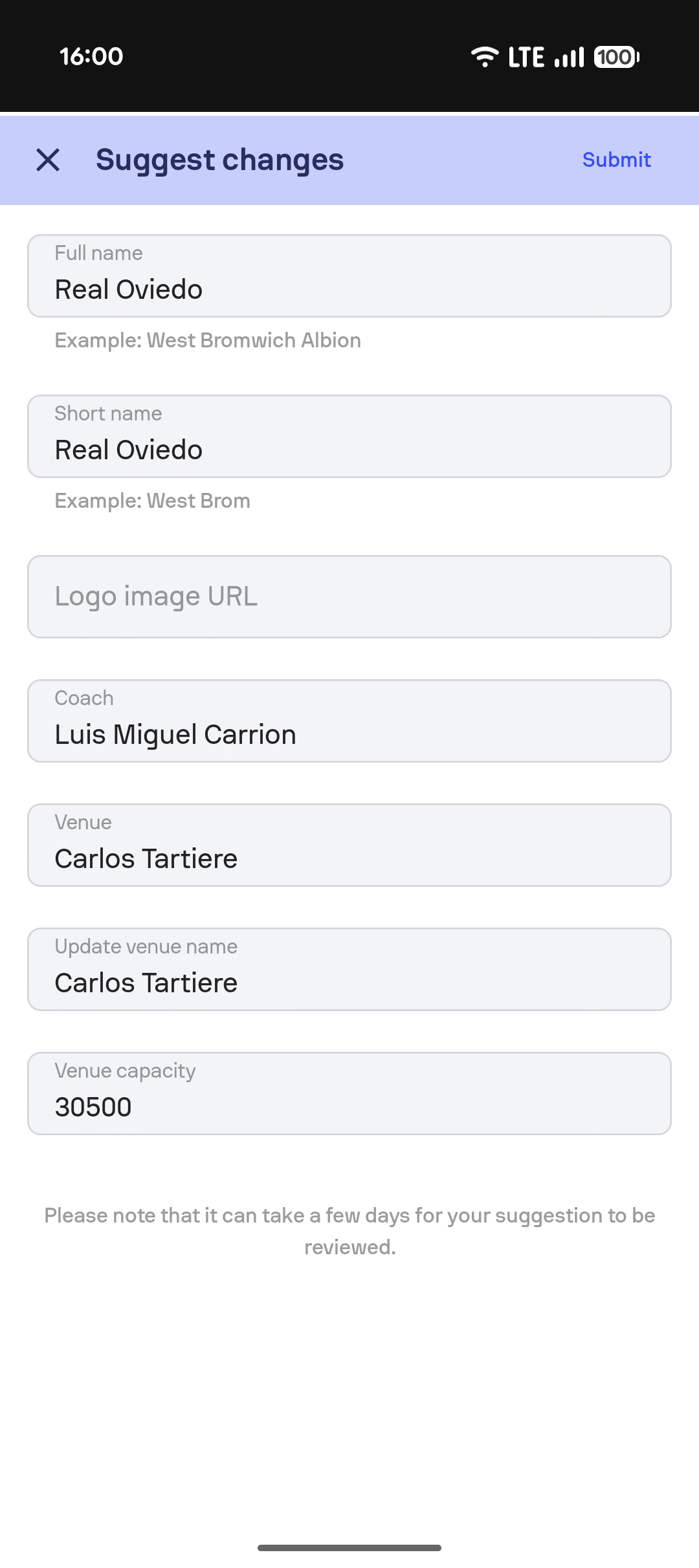 If you noticed a mistake or outdated information with teams and players, swipe down to the bottom of their details page and use option Suggest changes. You can also suggest new player transfers. Please note that it can take up to few hours or 2-3 days until your suggestion is reviewed by our team.