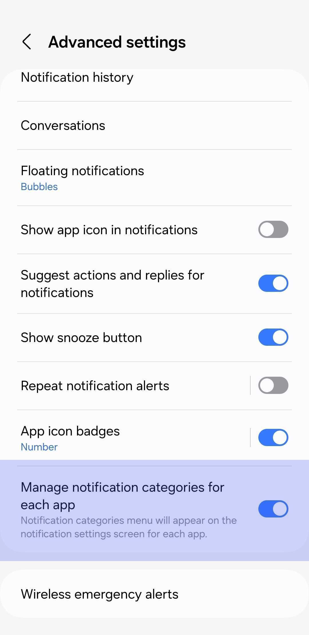 - At the bottom, find Manage notification categories for each app and toggle it on