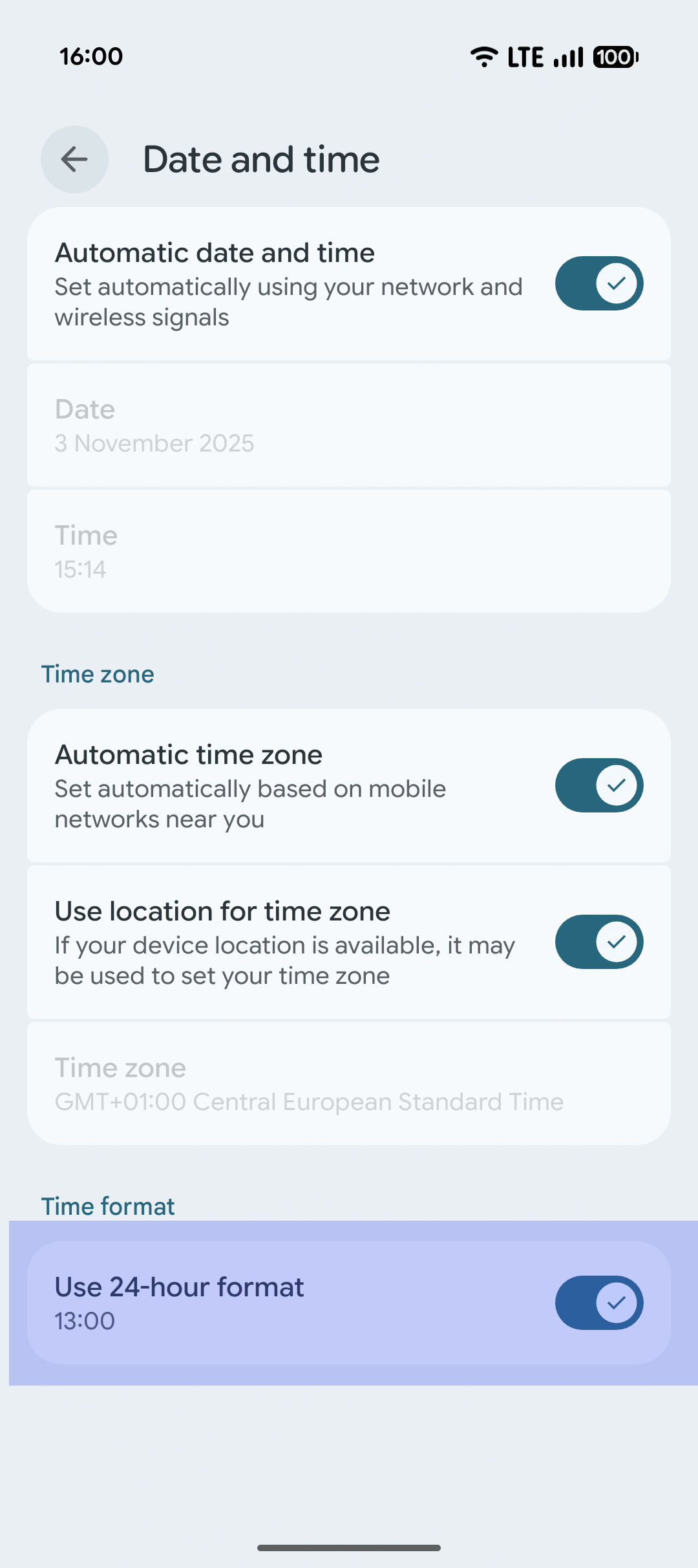 - Under Time format move slider to off for Use locale default